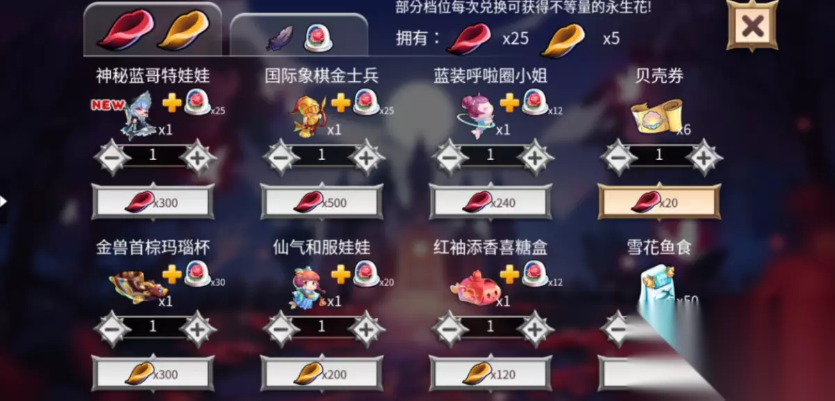 消耗收集到的两色花瓣可以兑换新鱼和其他奖励,兑换部分奖励还可以额外获得数量不等的永生花。