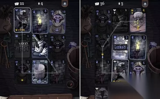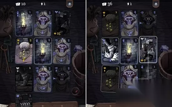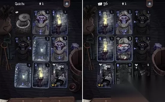 神偷往往是隐藏在黑暗当中的,但是火把卡牌的出现却让我们可以行动的区域变的非常有限,在火把的周围一切都会被照亮,而玩家可以让神偷将火把熄灭,让周围的一切陷入黑暗当中,不过这会引起一些守卫的注意。值得一提的是,当玩家通过点击绘制行进路线的时候,玩家可以看到周围卡牌即将做出的反应,例如原本点燃的火把会熄灭,周围的卡牌会变暗,而守卫的注意力会改变,有时候还会发出惊讶的表情并做出即将攻击的姿态,玩家可以针对情况改变自己的路线,让神偷可以避开危险。