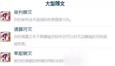 雕文推荐 大型符文:审判雕文、清算符文、奉献雕文。