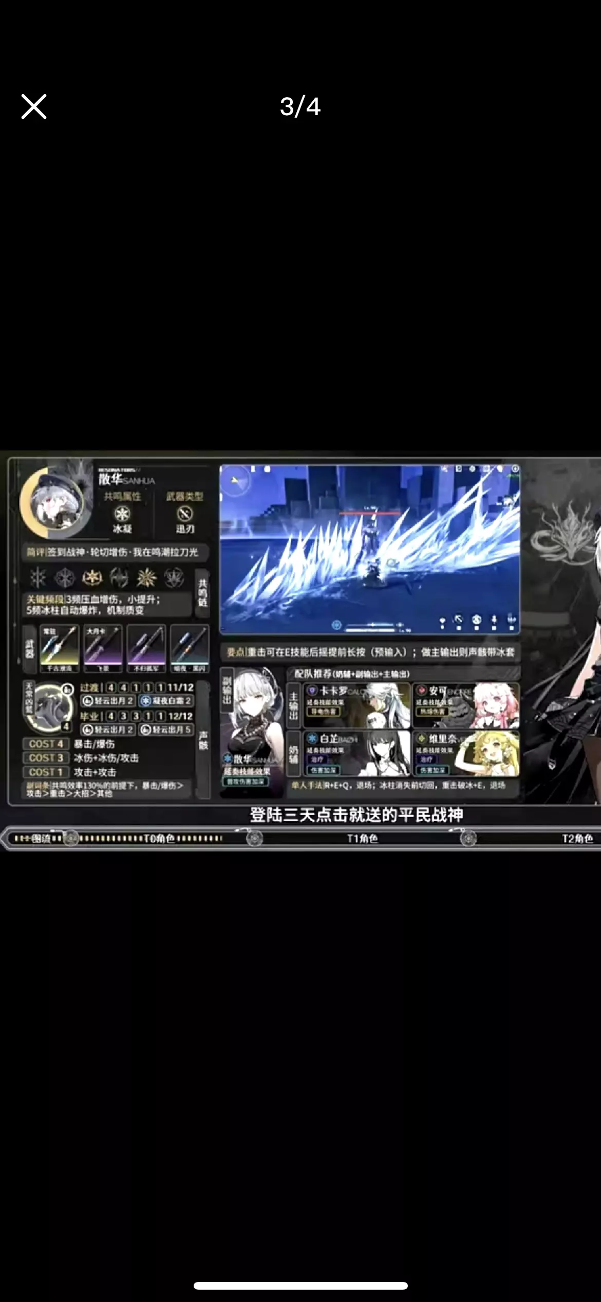 强烈推荐万金油副c散华 作为4星角色 散华获取难度低 只需签到三天获得 或者抽奖时不经意就出了 姐妹们快看看自己有没有散华鸭[哇R][哇R][哇R] 这里是散华保姆级培养攻略 希望能帮助姐妹们少走弯路[飞吻R][飞吻R][飞吻R] 散华是一个万金油副c,自身辅助能力大于输出能力 目前我个人认为所有阵容都适配 搭配已有的最强c位伤害很爆炸 过渡声骸推荐 轻云两件套 以及白霜两件套 四级声骸携带三头鸟 cost等级分配 44111 4级A暴率 4级B爆伤 三个1级刷攻击 中期声骸推荐 轻云五件套 成型43311 武器优选常驻池 五星讯刀 千古伏流 下位替代大月卡武器 飞景 锻造武器斩瞬刀 常驻四星西升 天赋加点优先 共鸣回路 共鸣解放>共鸣技能 >普攻 变奏技能 整理总结不易 希望姐妹们开荒顺利![派对R][派对R][派对R] #鸣潮#踏上鸣日的征程#鸣潮全球公测开启 #鸣潮角色攻略 #鸣潮攻略