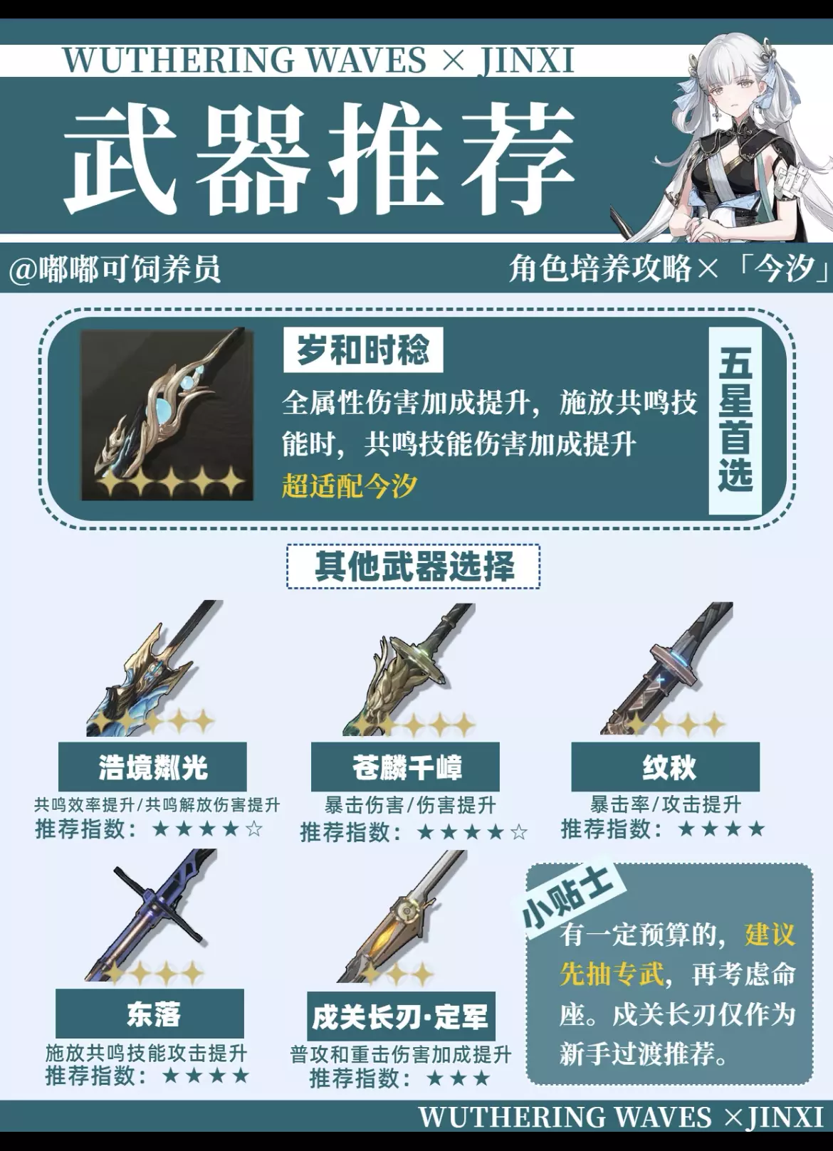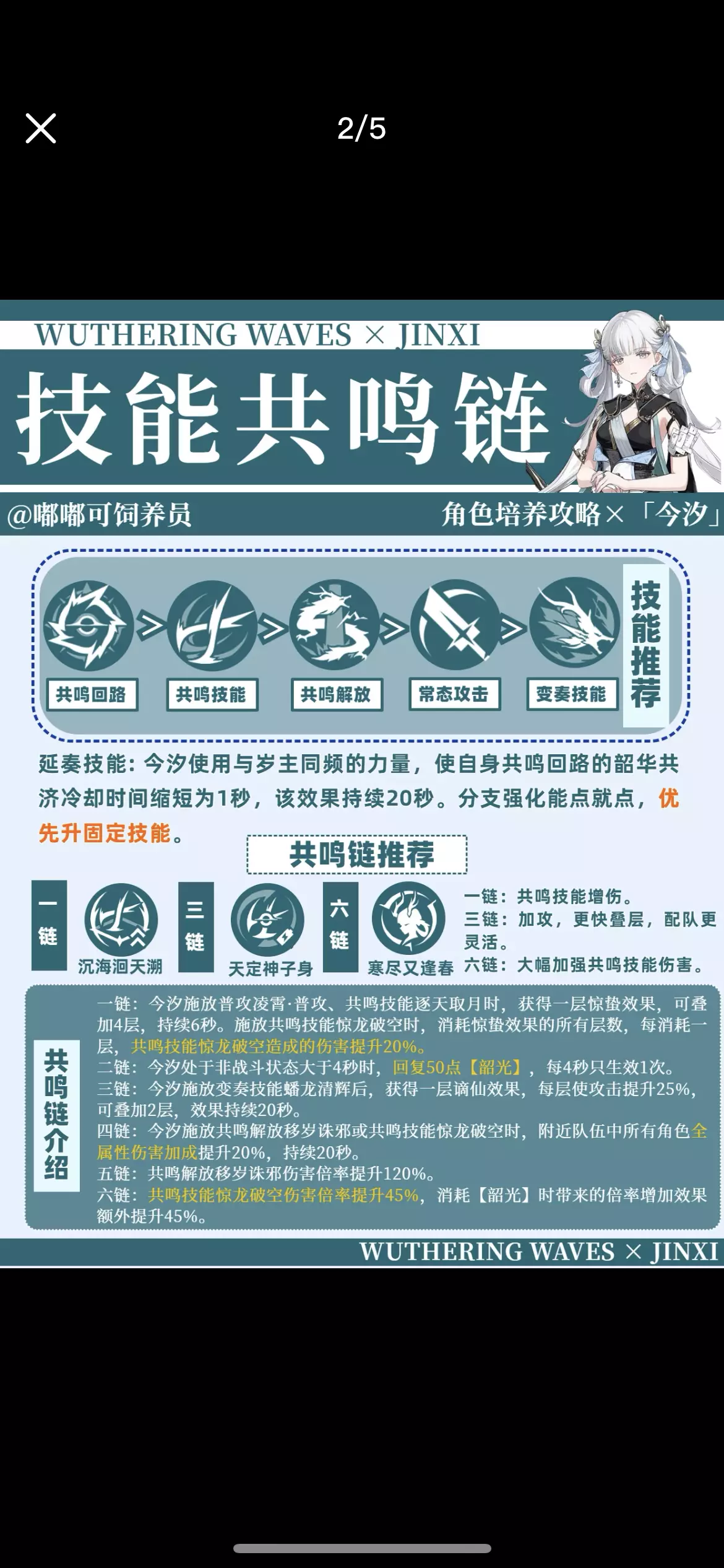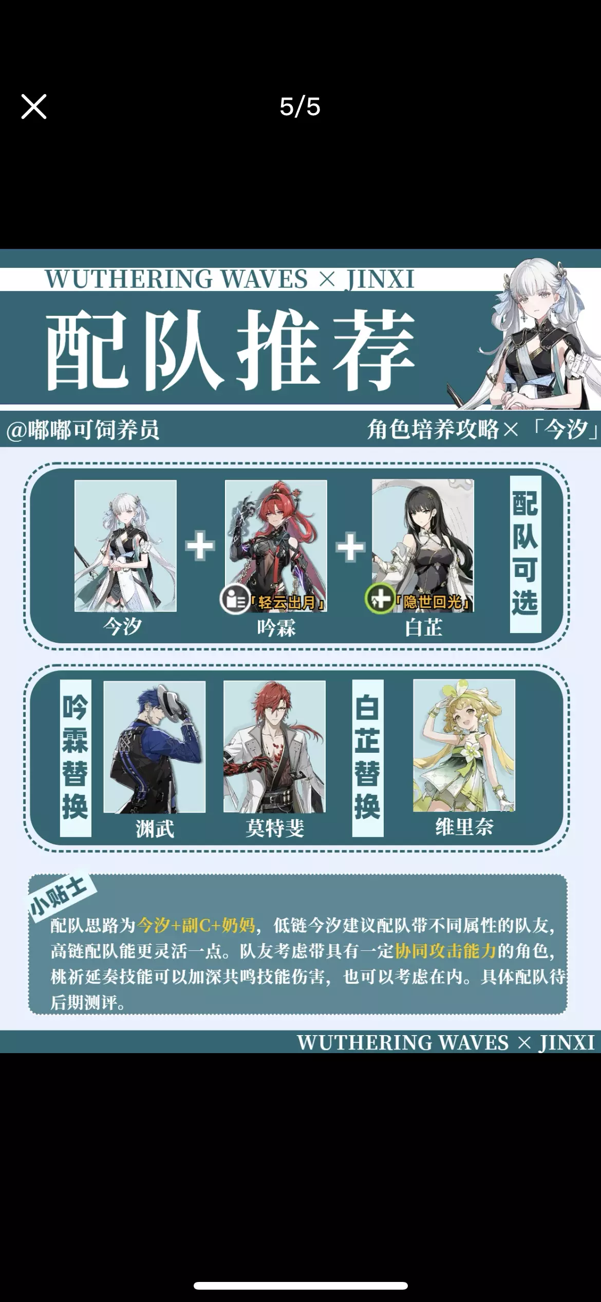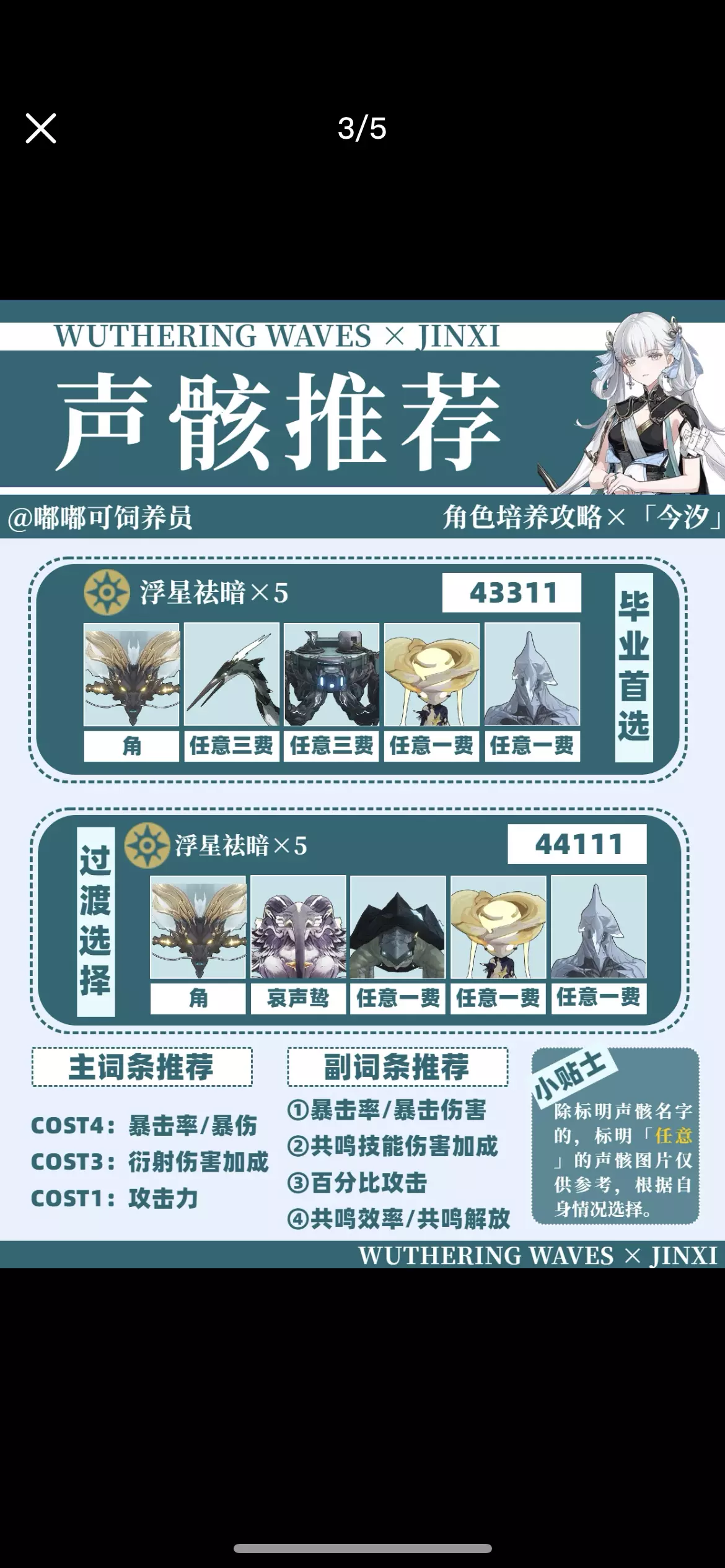 大家好呀,这里是嘟嘟可饲养员! 这次带来的是今汐角色培养攻略!主要包括声骸、武器、技能、共鸣链、配队等方面的攻略。命座方面推荐大家可以考虑抽取1命,如果有一定预算的话。 配队方面,队友建议吟霖,有一定的协同能力,桃祈能加共鸣技能伤害,也是能被考虑在内的。声骸方面首推浮星祛暗,最适配今汐,技能位推荐使用角,1.1版本会出这个新声骸的。这个攻略之后应该还会有所调整的,大家要有什么问题,也可以在评论区留言~ 提前叠甲:攻略仅代表个人观点!如有错误,立马修改hhh 非常感谢大家!#鸣潮 #鸣潮创作激励 #鸣潮今汐 #鸣潮日常 #鸣潮攻略 #鸣潮二创