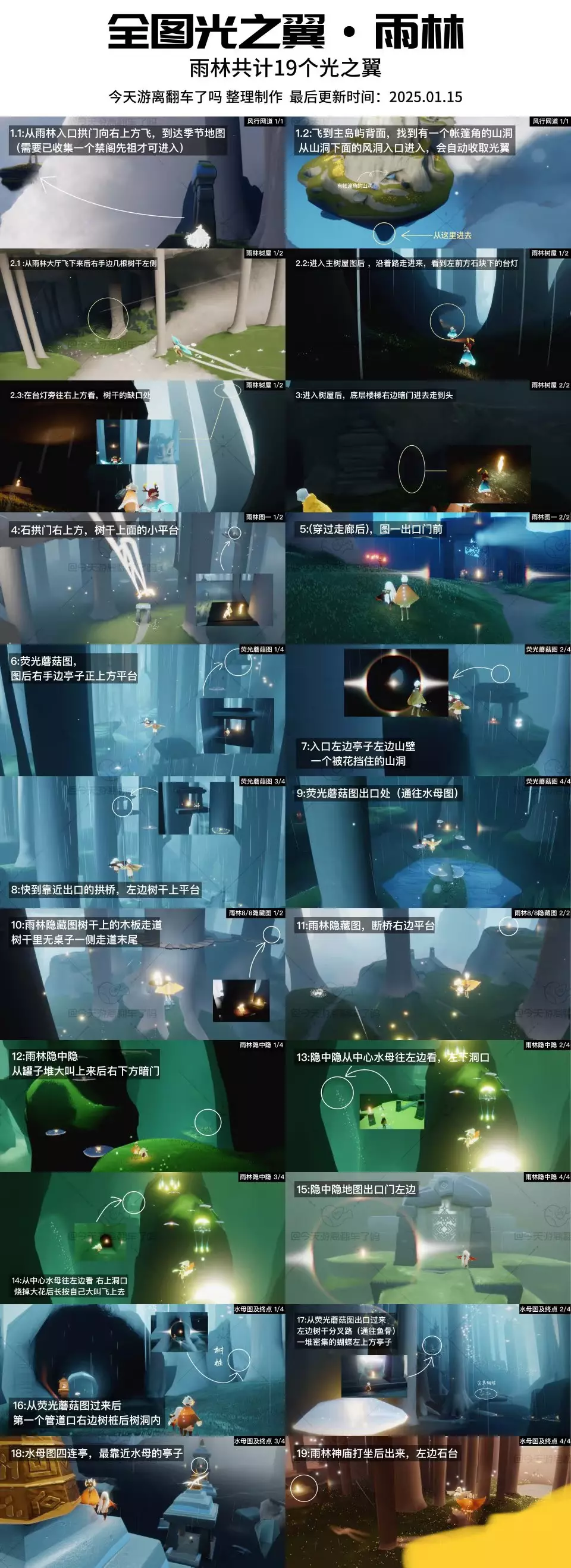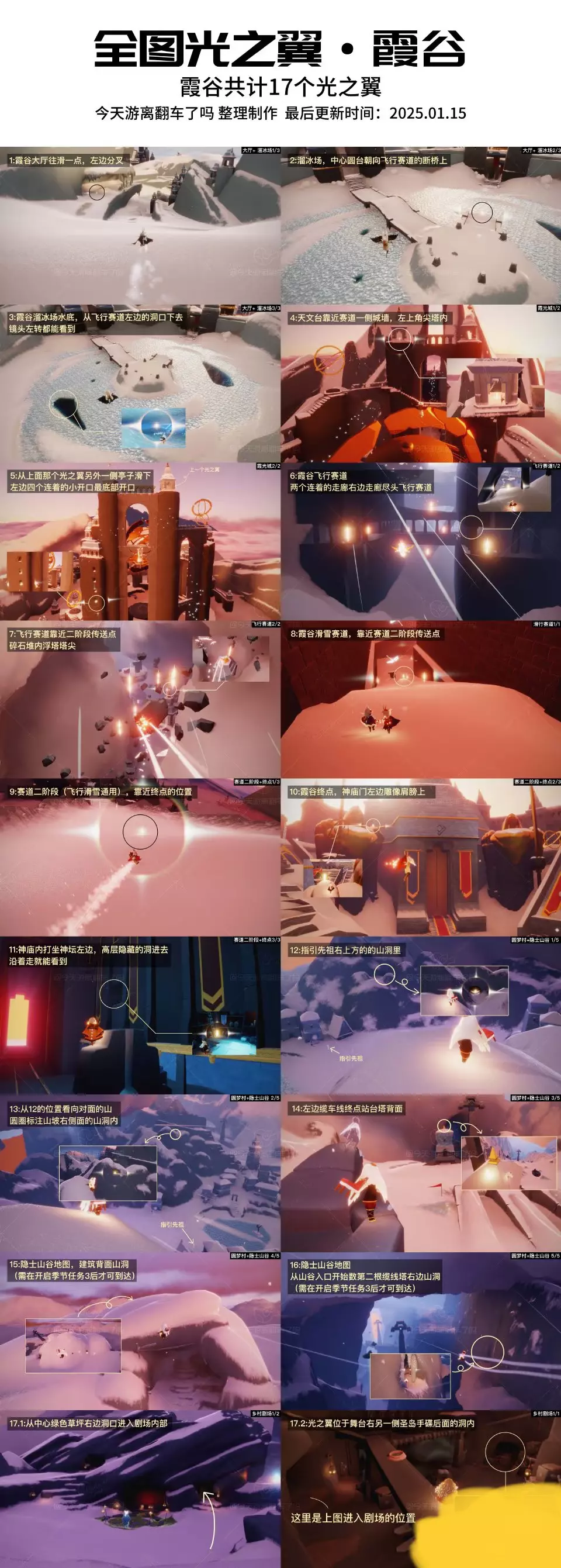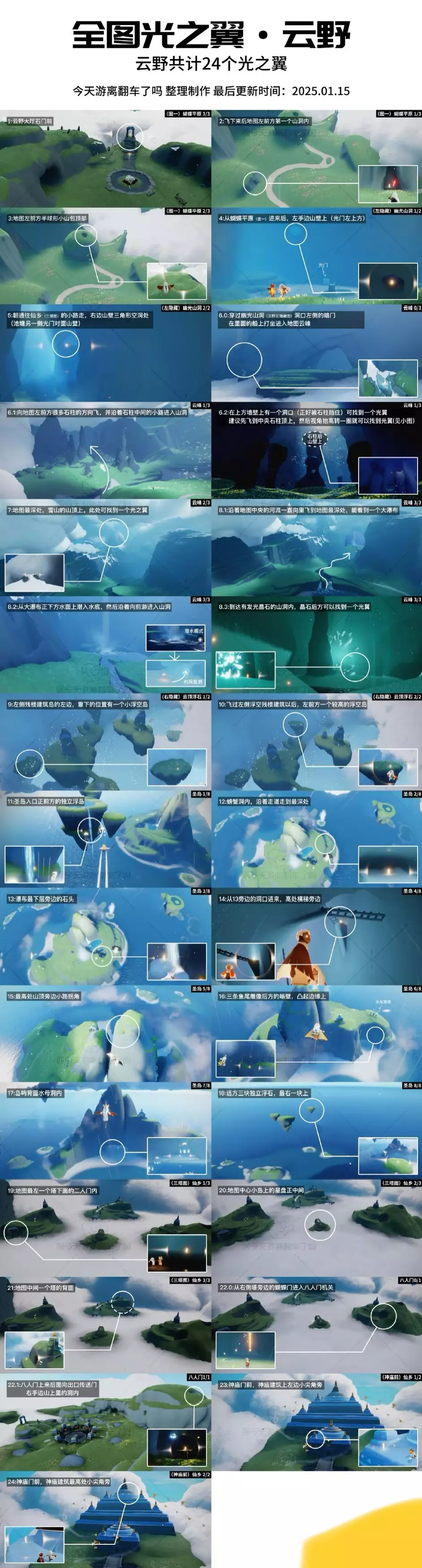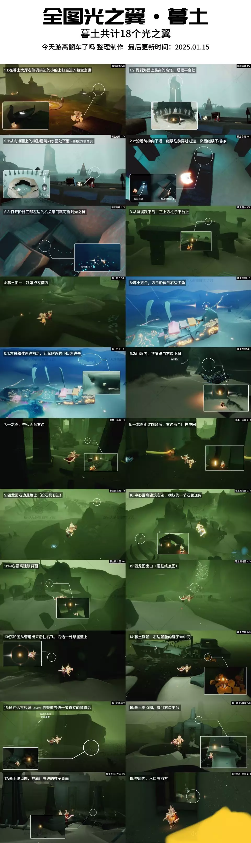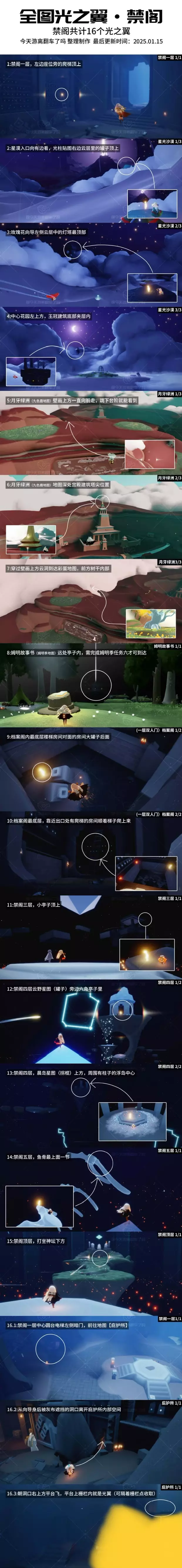 《光遇》光翼全收集攻略 (非季节图) 一、永久光翼获取方法 暴风眼献祭 入口位置:伊甸之眼终点(需完成六个常规地图通关) 刷新机制:每周一00:00(CST)重置献祭次数,单次最多可获得15根升华蜡烛(红蜡烛)。 操作流程: ① 献祭至少4个石像(建议全献祭以最大化升华蜡烛数量); ② 重生后进入星盘界面,选择任意先祖,消耗升华蜡烛解锁其主干上的“光翼节点”(无需解锁所有道具); ③ 解锁后永久生效,每次重生自动继承该光翼。 注意事项:永久光翼与普通光翼独立计算,可叠加提升翅膀等级。 二、普通光翼收集路线(全地图共120个) 晨岛:6个(初始1个 + 神庙后5个) 云野:13个(含隐藏图蝴蝶平原、三塔图) 雨林:16个(重点:荧光森林、密林遗迹) 霞谷:11个(赛道终点、圆梦村) 暮土:14个(沉船图、四龙图、远古战场) 禁阁:8个(分层电梯、顶层星光台) 试炼:4个(水/土/风/火试炼各1个) 暴风眼:10个(建议熟练后携带好友同行) 💡 小技巧: 光翼每日刷新,可在“遇境”查看地图光翼数量提示(光点标记)。 使用“背背飞天”“螺旋遁地”等技巧可快速抵达隐藏点位。 三、光翼等级与数量对照 当前版本(2025年2月)最高可收集 243个光翼,对应十二级翅膀(200个)。 永久光翼:通过先祖解锁(初始先祖49个 + 复刻先祖73个) + 献祭后自动获得1个。 普通光翼:全地图固定刷新120个,无需重复解锁。 四、避坑指南 暴风眼时机:建议每周一刷新后尽早献祭,避免网络波动导致数据丢失。 星盘解锁优先级:优先解锁常驻先祖的“光翼节点”,复刻先祖需等待返场。 光翼刷新机制:普通光翼每日0点重置,若未收集完毕,次日可继续补全。 ✨ 总结:结合永久光翼解锁与全地图收集,可快速提升翅膀等级。建议先完成暴风眼献祭获取红蜡烛,再逐步扫图查漏补缺!#光遇攻略 #光遇sky #光遇萌新 #光遇 #光遇跑图