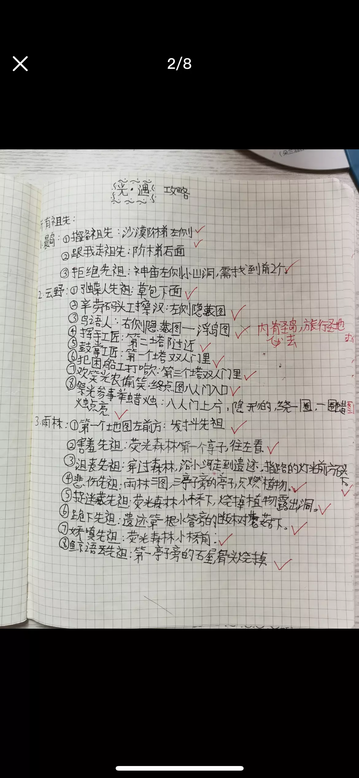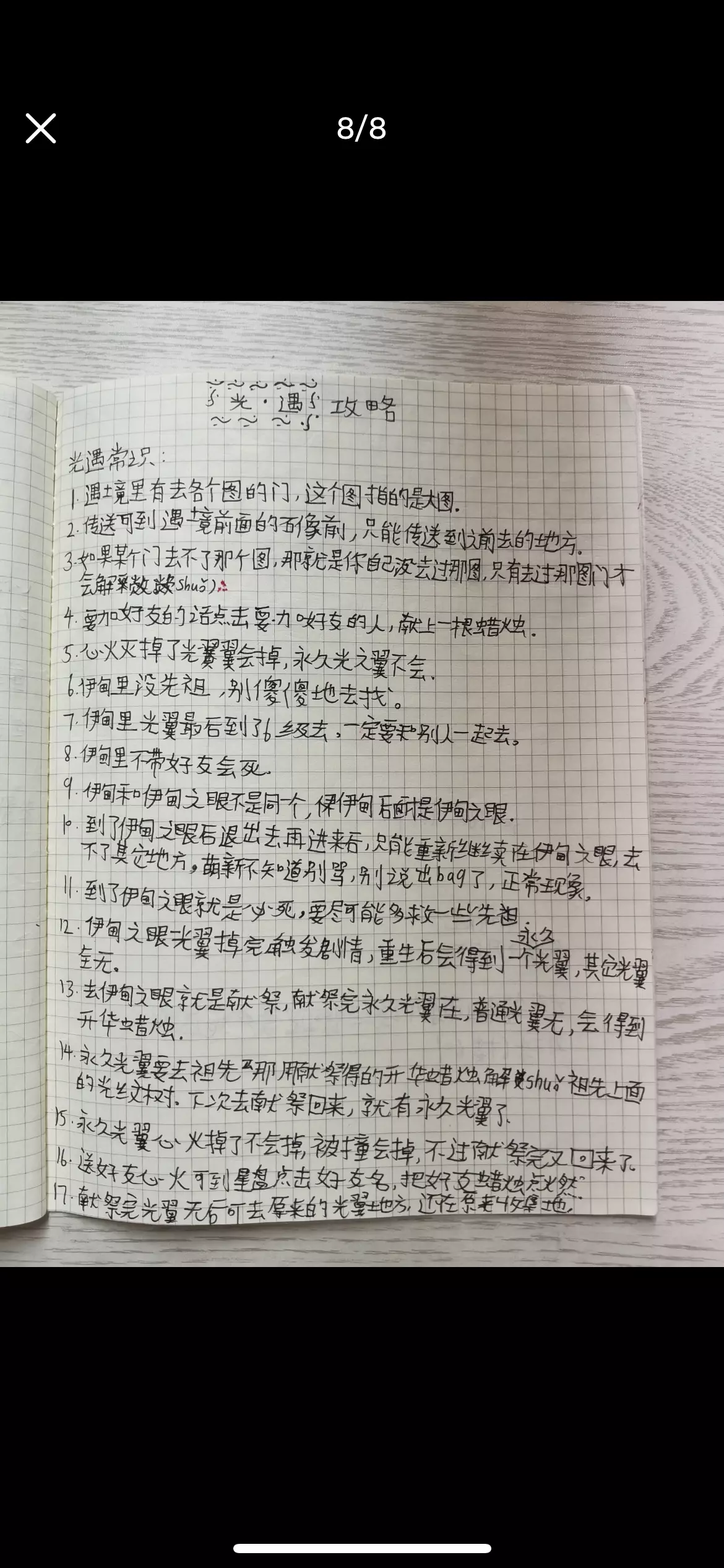 哈哈,收拾书柜时找到的(无本)里的。这个还是我萌新时期做的,当时玩了一个月才知道怎么聊天,还一直好奇别人怎么聊天的。然后辛辛苦苦攒了六十个翼去献祭,当时不知道翼会没,献完祭回来难受死了。哎,玩不了喽,号也送人了~( ´•︵•` )~#光遇 #攻略