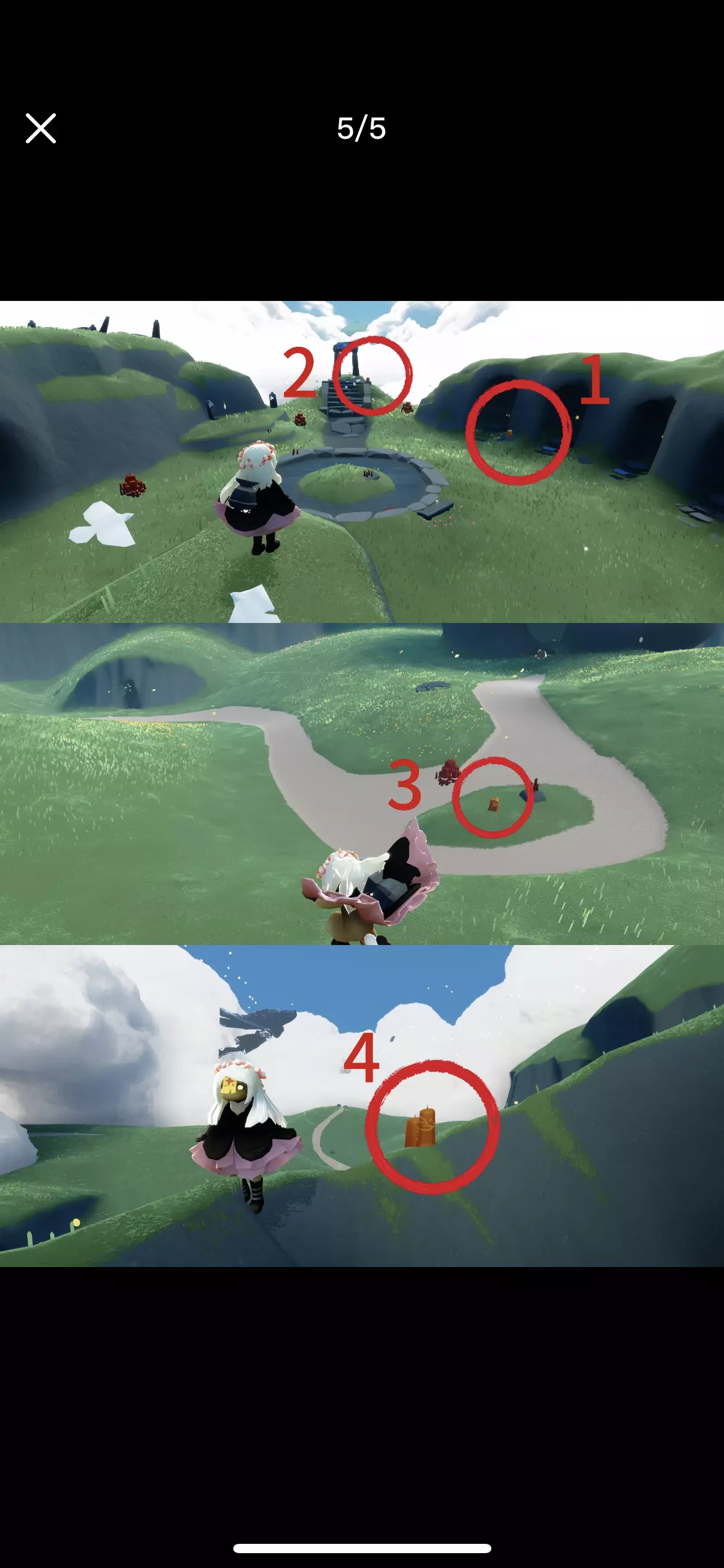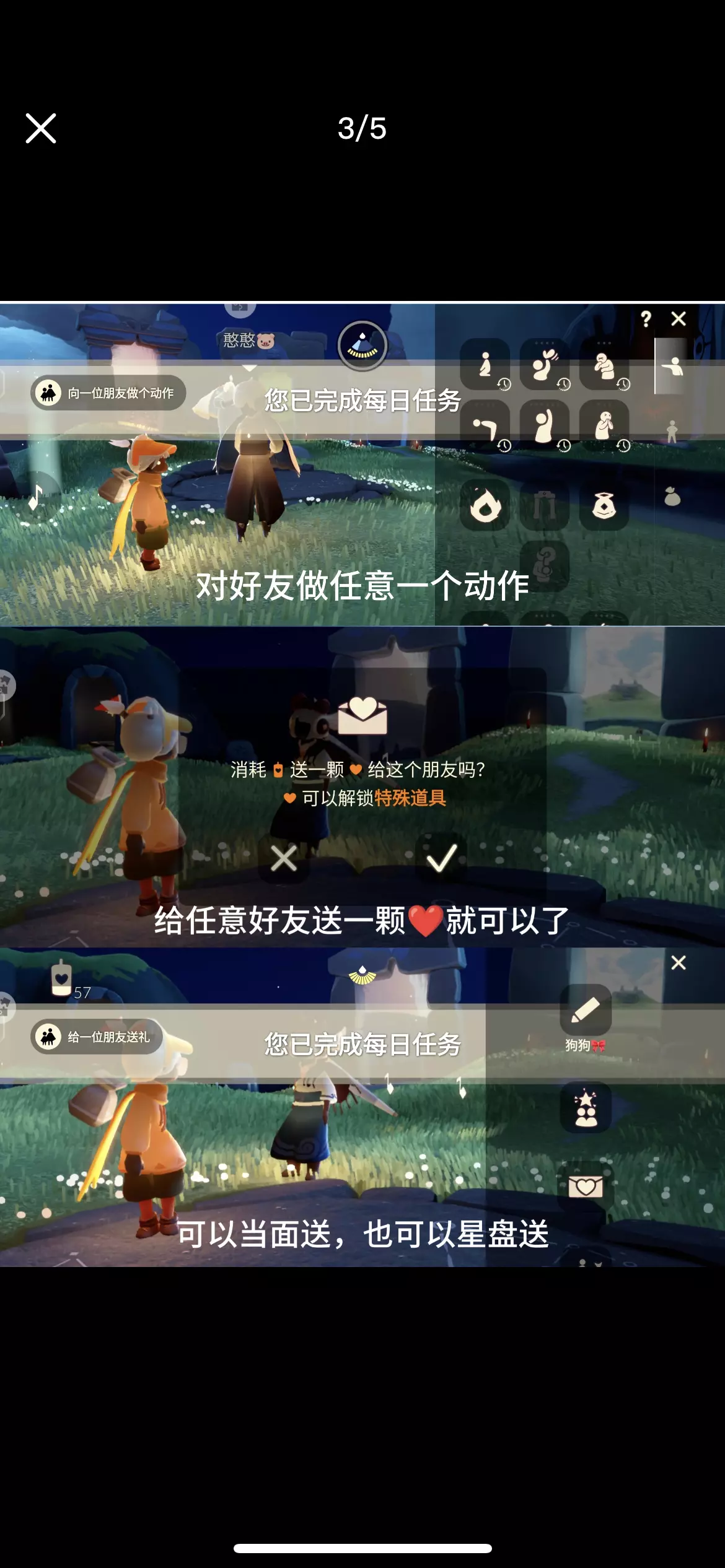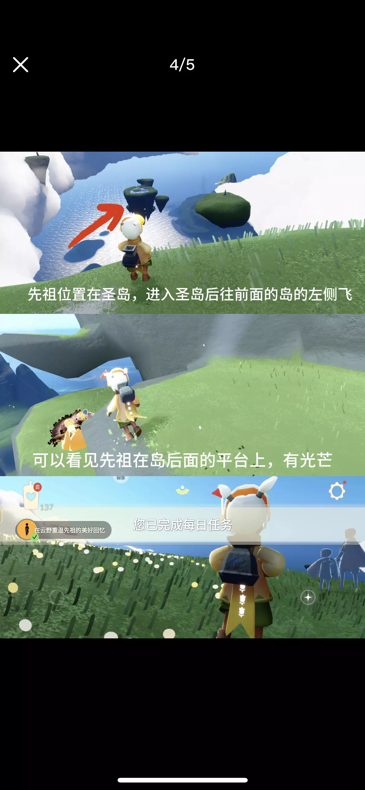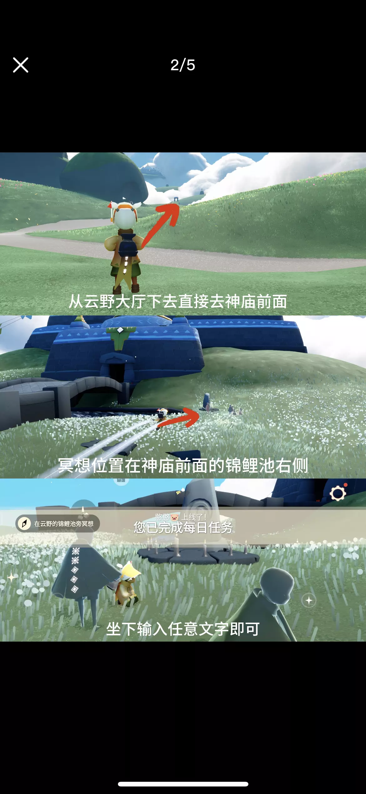 1. 在云野的锦鲤池旁冥想:锦鲤池在云野神庙前面的桥下,冥想位置在面对神庙入口的右侧 2. 向一位朋友做个动作:对朋友使用任意一个动作 3. 给一位朋友送礼:给任意一位朋友送一颗❤️,可以星盘送也可以当面送 4. 在云野重温先祖的美好回忆:先祖位置在云野圣岛,进入圣岛后直接往左前方浮岛飞,先祖位置在岛的后面 5. 季节蜡烛位置:云野 #光遇 #光遇攻略 #光遇每日任务 #光遇与自然共生 #光遇迁徙季