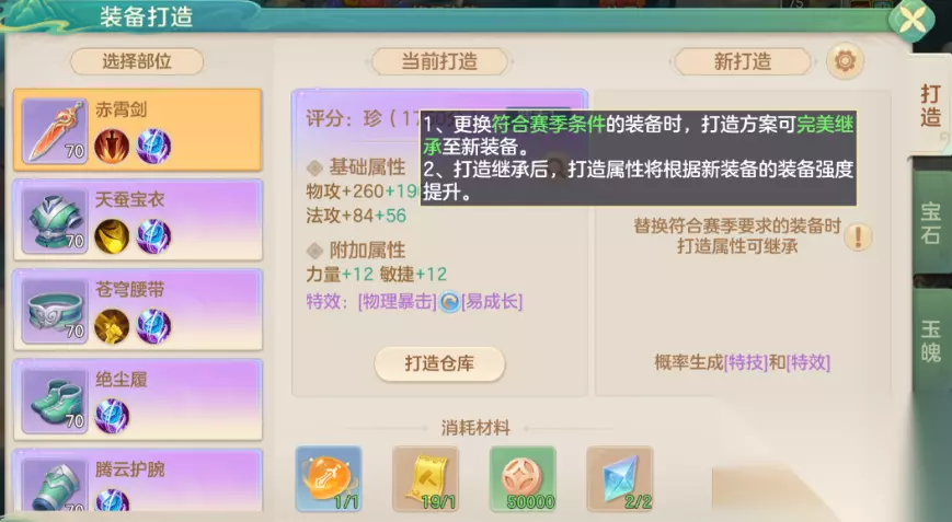 二、装备 装备是提升实力的有效选择,每一个角色都可以穿戴武器、鞋子、帽子等8件装备,品质会从低到高分为黄、绿、蓝和紫四个品阶,品阶越高带来的属性就越强,前期想要获取装备主要靠掉落和打造,掉落是参与副本等玩法,我们选择的难度越高,掉落的品质就会越好,打造要用到装备打造灵和打造符来进行,其中装备打造灵可以通过银票市场、悬赏任务来获得,打造符则需要通过摊位或消耗火力来获取; 每一件装备都可以镶嵌宝石来得到提升,镶嵌的等级上限会随着大家等级的提升来逐步开放,大家可以根据自己想要的属性需要,来决定镶嵌不同类型的,手上获取的装备属性如果不是大家需求的,可以使用如意宝玉来进行属性上的转换,同时词条不需要也可以运用重锻石来进行改变,不过每一件只可以选择一条词条来装换。