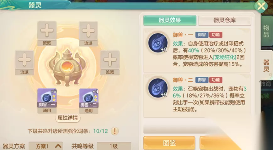三、器灵 器灵会被分为流派和通用两种,不仅能给大家带来基础属性加成,还能带来强力的特殊效果,随着等级的提升大家最多可以带上6个器灵一起战斗,这其中必须要带上4个流派的和2个通用,大家可以通过点击了解它们的能力后选择合适的搭配方案,每一个器灵都可以进行升级,升级不仅会加强属性和特殊效果,还会增加词条的数量,有概率获得更多增益效果,而升级需要花费器灵经验石,这个的获取方式为将其他不需要的器灵熔炼,这样获得经验石,最后总体获取到的属性会和熔炉器灵的等级和品质相关。