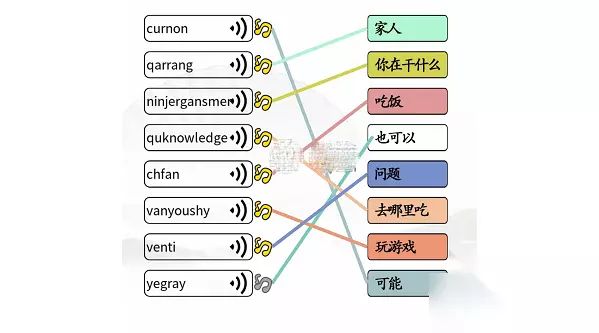 汉字找茬王游戏中每个关卡主题不同,这次的关卡连线岚语很多玩家不知道怎么玩,小编这就为大家分享一下这次的关卡汉字找茬王连线岚语的通关攻略,相信按照小编的攻略一定能帮助你顺利通关,一起来看看吧。 汉字找茬王连线岚语过关攻略 1、【连线岚语】需要连接对应的词语,分别是: vanyoushy——玩游戏 ninjergansmer ——你在干什么 chfan——吃饭 venti——问题 curnon——可能 qarrang——家人 yegray——也可以 quknowledge——去哪里吃 2、对岚语不了解的玩家,可以通过首字母和基本读音进行猜测。比如ninjergansmer 读起来就像是你在干什么,chfan就是吃饭,venti读起来也很像问题,按照这种思路,全部连接完成即可
