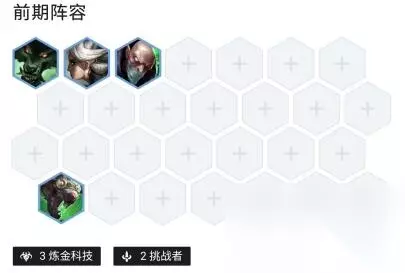 六、运营打法 1、前期过渡 前期羊刀过度还是比较平滑的,推荐用沃里克带装备配炼金和挑战者羁绊既有输出也有坦度,可以在不卡经济的情况下留一张男枪或者盖伦。