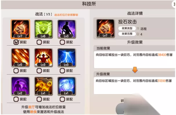 进击吧!三国【进击吧!三国】科技所及战法玩法介绍如下: 众做周知,在文明发展的历史长河中,科技的不断进步给人类和世界带来了很多改变。在幻想Q传中,科技所对于掠夺战十分重要,玩家能够通过科技所激活或升级强力的战法,在掠夺战中运用多种战法策略在攻城中发挥至关重要的作用。 科技所介绍 需要大家注意的是科技所是在【政厅Lv4】的时候解锁的功能建筑;提升科技所的等级可以逐步解锁战法,使用粮食可以激活或者升级战法。