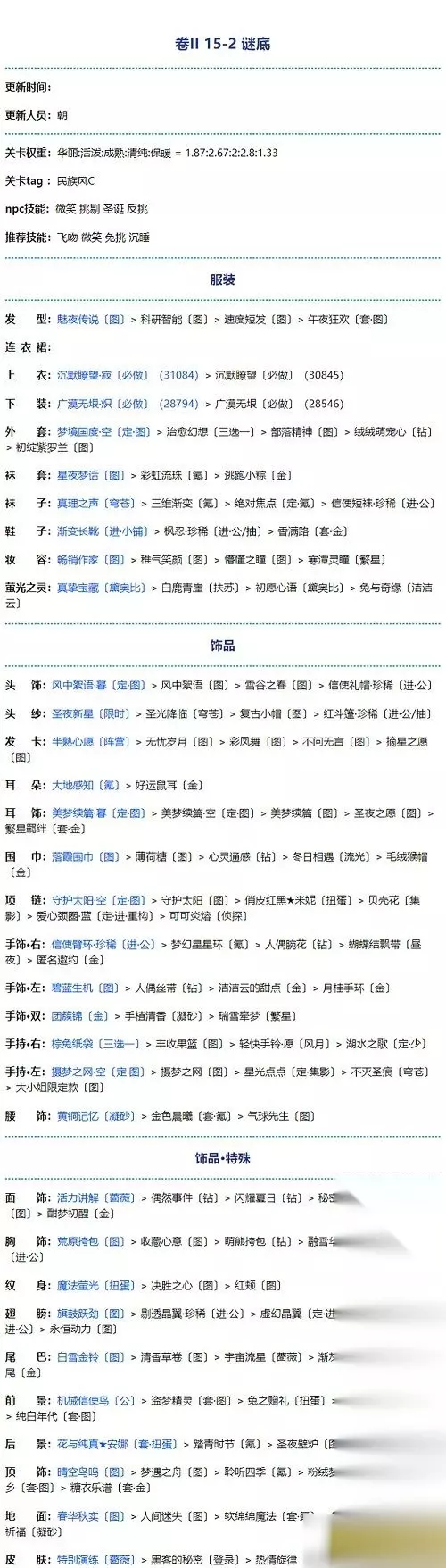 发型:魅夜传说〔图〕>科研智能〔图〕>速度短发〔图〕>午夜狂欢〔套图〕 连衣裙: 上衣:沉默瞭望·寂〔必做〕(31084)>沉默瞭望〔必做〕(30845) 下装:广漠无垠炽〔必做〕(28794)>广漠无垠〔必做)(28546) 外套:梦境囯度空〔定·图〕>治愈幻想〔三选一〕>部落精神〔图〕>绒绒萌宠心〔钻〕>初绽紫罗兰〔图〕 袜套:星夜梦话〔图〕>彩虹流珠〔氪〕>逃跑小粽〔金〕 袜子:真理之声〔穹苍〕>三维渐变〔氮〕>绝对焦点〔定·氪〕>信使短袜珍稀〔进公〕 鞋子:渐变长靴〔进·小铺〕>枫忍·珍稀[进公/抽〕>香满路〔套·金〕 妆容:畅销作家〔图〕>稚气笑颜〔图〕>懵懂之瞳〔图〕≯寒潭灵瞳〔繁星 董光之灵:真挚宝藏〔黛奥比〕>白鹿青崖〔扶苏〕>初愿心语〔黛突比〕>兔与奇缘〔洁洁云〕 以上是小编为各位带来奇迹暖暖卷二15-2谜底完美搭配攻略的全部内容,更多精彩游戏资讯,请持续关注233乐园。