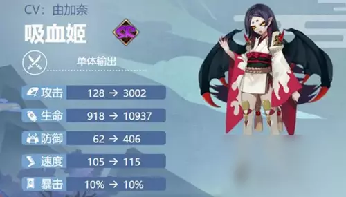 【阴阳师式神图鉴大全2023】 阴阳师吸血姬人物介绍 姓名:吸血姬 性别:女 稀有度:SR 获取方式:召唤、碎片合成 输出类型:单体输出 CV:由加奈 人物简介:吸血姬本是一个普通少女,但突然有一天,爸爸离奇死亡,她被母亲咬了一口就喜欢上了血液
