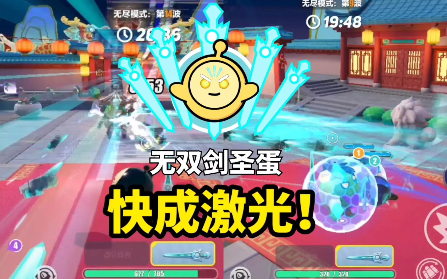 这是一期《蛋仔派对》的游戏解说,展示了玩家组队玩特种蛋无尽模式的过程,玩家使用剑仙技能战斗,面对升级选项时纠结是否选基础专精,还和队友交流通关相关内容,疑惑剑仙伤害与变异蛋血量的平衡问题。