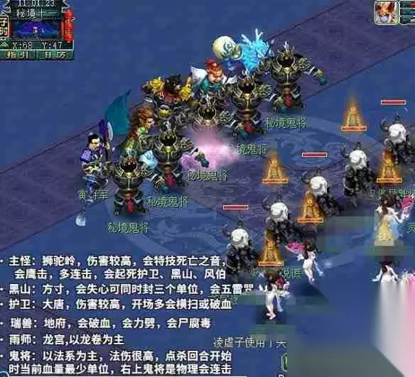 BOSS技能机制: 主怪(狮驼岭): 高伤害输出,拥有死亡之音、鹰击、多连击等技能。更可怕的是,只要有小怪存活,它会复活后排护卫、黑山和风伯! 黑山: 使用失心符,可同时封印己方三个单位,并施放五雷咒。 护卫: 伤害很高,开场通常使用横扫或破血狂攻。 瑞兽: 擅长破血、力劈华山和尸腐毒。 雨师: 主要技能是龙卷风,可被主怪复活。 鬼将: 前排鬼将以法系为主,法伤很高,会优先攻击当前血量最低的单位(玩家或宠物)。 注意:右上角鬼将是物理攻击!