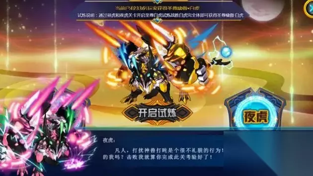 白虎试炼打法介绍: 试炼规则: 要求我方5层白虎守卫的试炼以及白虎真身的试炼即可过关;此外已出战并战胜的精灵无法继续出战,因此如何安排自己的精灵显得非常关键。注意的是要用天尊之灵来打关卡,天尊之灵只在昼夜虎关卡概率掉落。 第一层打法介绍:瀚宇星皇 特性:只吃暴击伤害 由于只吃暴击伤害,因此建议是用魔王咤或是幻境来引爆输出打败即可。