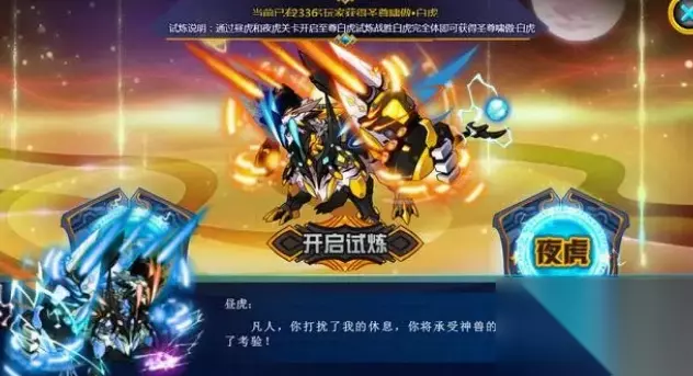 夜虎 每天18点到21点开放,击败夜虎封印8门,可以选择一次封印1/2/3门,如果按照条件击败可直接完全封印一门,否则只能封印1/3门,要连续封印3次才能完全封印。特性与昼虎类似,比较随机,可以用索比斯加翼娘击败,遇到强化虎也可以用幻境击败,弱化虎可以用王哈携带反弱来击败。