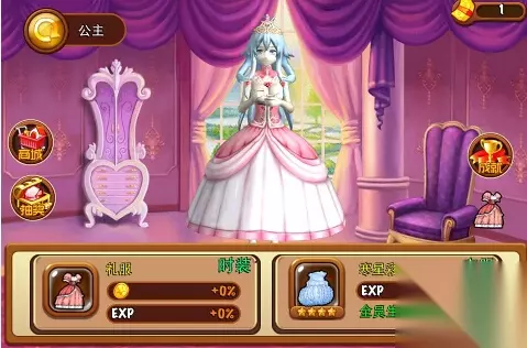 点开下方的公主按钮后,会进入公主的房间。里边可以更换公主的时装(外形),公主时装拥有增加通关后获得的经验和金币等功能。 还可以更换公主的衣服(属性)可以增加全队的攻击力和生命值。只需要手指点击装备即可更换时装或衣服。