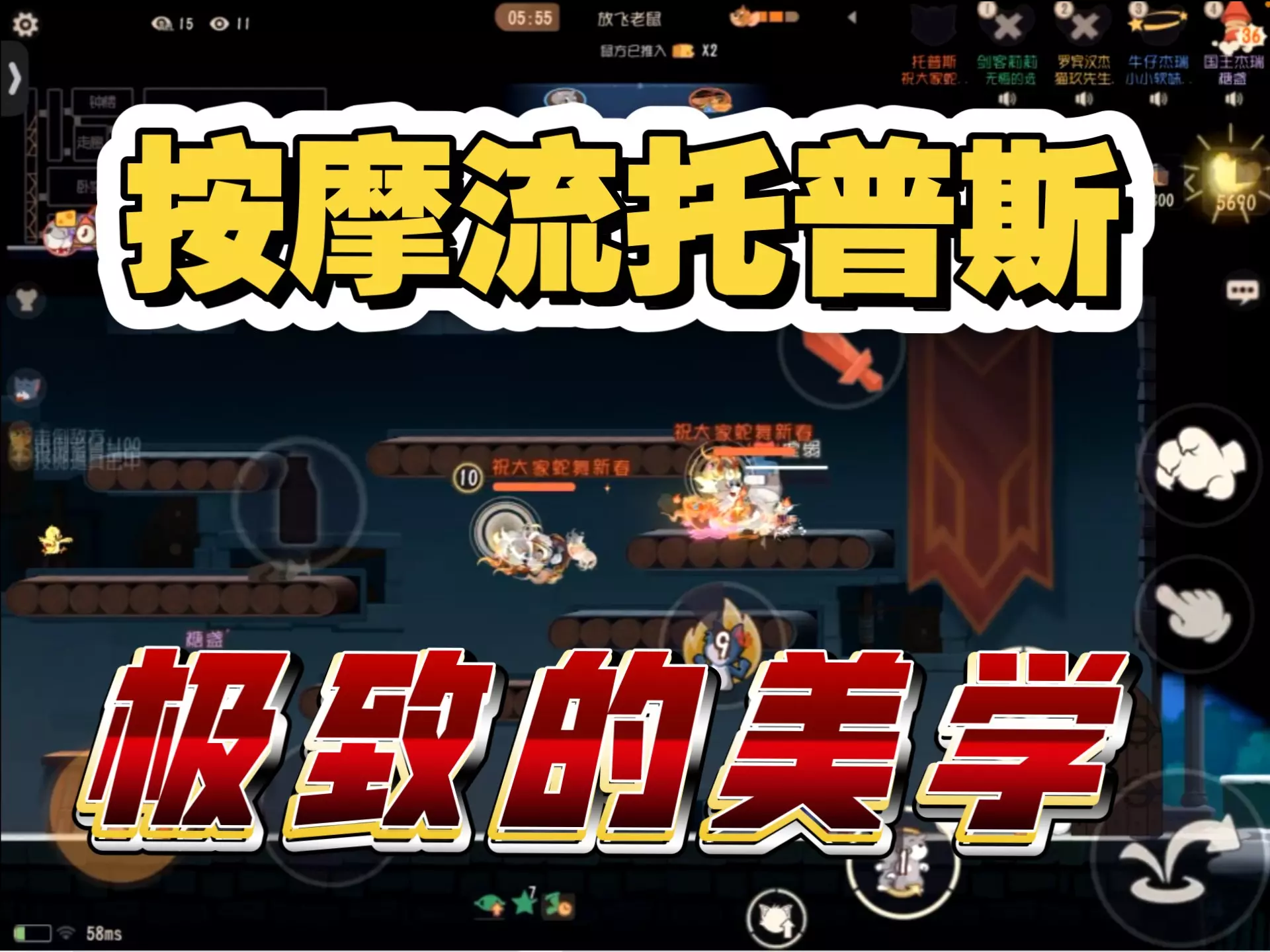 这是《猫和老鼠手游》的对战内容,展示了玩家操控猫角色托普斯在对局中凭借出色的预判,和老鼠阵营展开精彩对抗的过程,呈现了游戏内的趣味对战场景。