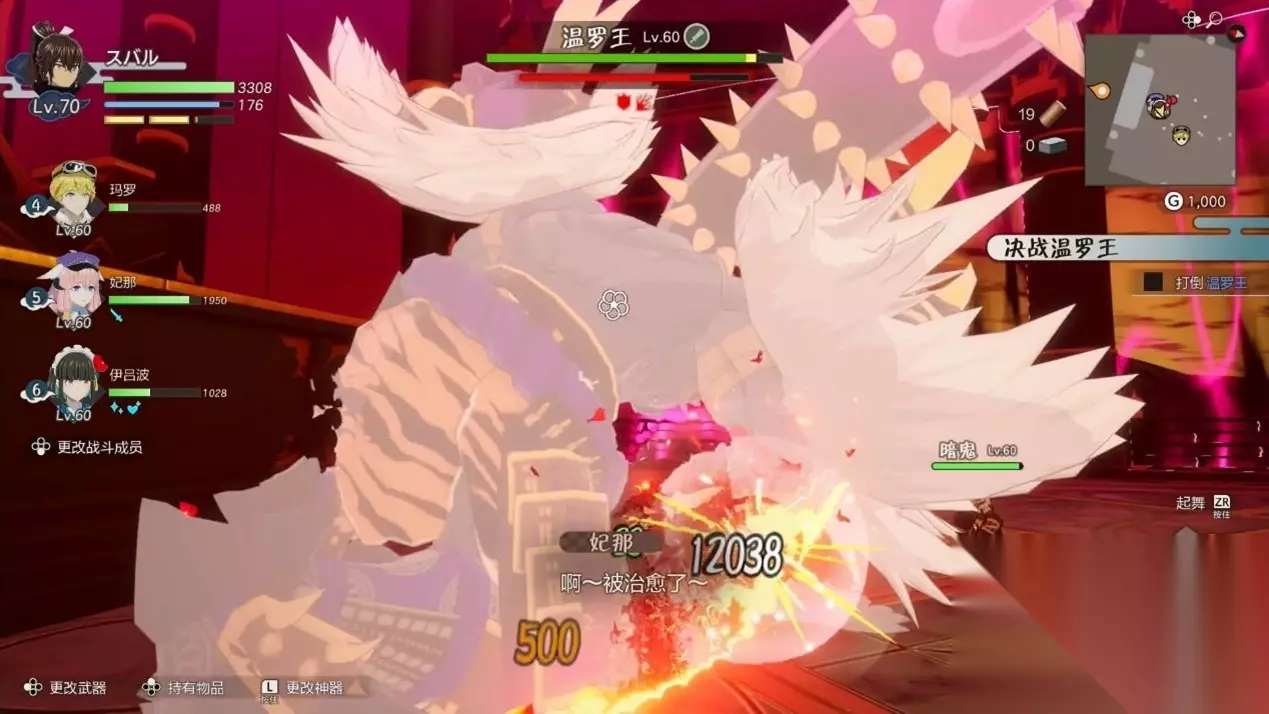 《符文工房 龙之天地》评测:8 分 | 233乐园 中国 一窥「东国」世界全貌 开发商给我们提供了数个游戏存档,分别对应几个特定的展示场景,现场体验平台为 NS 主机,跟我做评测使用的 Steam 版相比虽然在分辨率和帧数上有明显的劣势,但运行情况十分稳定,也并没有因为制作方通过特殊手段调整了游戏的进度而出现崩溃、恶性 Bug 等情况,这从一个侧面印证了游戏的运行稳定性。 第一个存档点在游戏中后期的 BOSS 之一「温罗王」房间门口,主角达到 70 级,三位队友均为 60 级,算是一个比较中规中矩的强度以及队伍构成。