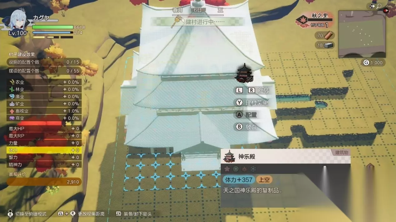 在另一个存档中主角已经解锁了游戏里全部可以用于种植的种子、建筑以及装饰道具,利用即使在 NS 主机上也非常便捷的「俯瞰模式」,可以瞬间从背后视角切换成从高空俯视自定义地块的视角,在此状态下无论是翻地、播种、洒水还是大面积地平整地形、修建道路等等,都十分方便,即便用 NS 的手柄操作也毫无难度。 顺带一提,游戏的俯瞰视角下还支持用 PC 版的鼠标以及 NS2 主机 Joy-Con 2 手柄的鼠标模式来进行建设操作,易用性比单纯的手柄提升了不少,这也算是 NS2 版的一大优势。 在《龙之天地》里玩家能依次解锁春夏秋冬四个村庄,里面有一些固定的 NPC 和建筑物,留给玩家耕种以及建设的区域为数个呈四边形的地块,初始状态下这些地块里要么分布着零星的巨石、损坏家具等障碍物,要么直接被各种诅咒所占据,前者只需要切换到锄头状态就能轻易去除,后者则必须解锁了神器之后,利用神器的属性攻击来抵消诅咒,不断拓展村庄里的可自定义地块规模。