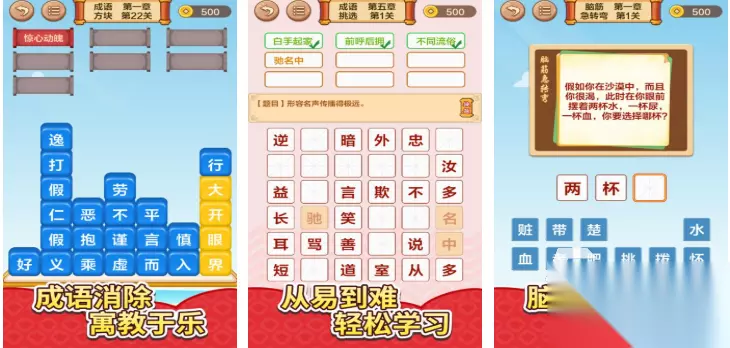 成语游戏爱好者和小学生们都可以玩玩这款成语游戏,成语接龙的主题玩法和丰富的关卡设定耐玩性更强,点触式的操作比较简单可轻松完成形形色色的成语任务,每一关呈现出的成语知识点都很多,助力孩子轻松记住更多的成语常识,耐玩性十足的各种模式和关卡设定吸引到的小学生更多。 高速下载 普通下载 优先233乐园APP下载 2、《成语接龙闯关》