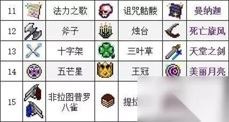 11、法力之歌+咒脂酸=【曼纳迦】 12、斧子+烛台=【死亡施风】 13、十字架+三叶草=【天堂之剑】 14、五芒星+王冠=【美丽月亮】 15、非拉图普罗/八雀+提拉米苏=【菲拉吉】