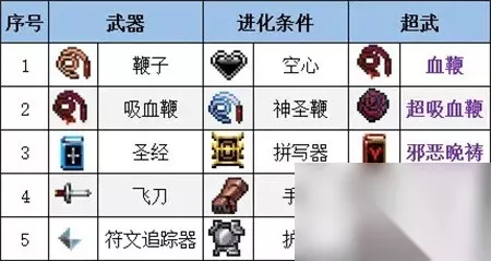 吸血鬼幸存者武器合成表大全2024 1、鞭子+空心=【血鞭】 2、吸血鞭+神圣鞭=【超吸血鞭】 3、圣经+拼写器=【邪恶晚祷】 4、飞刀+手套=【千刃】 5、符文追踪器+护甲=【破坏】