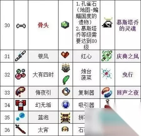 31、银风+红心=【庆典之风】 32、大有四时+烛台+菠菜=【曳行】 33、悔夜引+复制器=【回声之夜】 34、幻无垢+吸引器=【乔多尔】 35、蓝泡+拼写器=【虚幻气泡】 36、太宵+石面具=【村正】