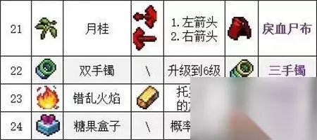 21、月桂+左箭头+右箭头=【实血尸布】 22、双手锡+升级到6级=【三手镯】 23、错乱火焰+托罗纳的盒子=【穆斯佩尔的骨灰】 24、糖果盒子+概率开出=【超级糖果盒】 25、白鸟+双子座卡片=【天鹅座】