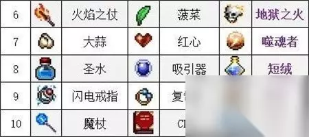 6、火焰之仗+菠菜=【地狱之火】 7、大蒜+红心=【噬魂者】 8、圣水+吸引器=【短绒】 9、闪电戒指+复制器=【雷环】 10、魔杖+cd书=【圣魔仗】
