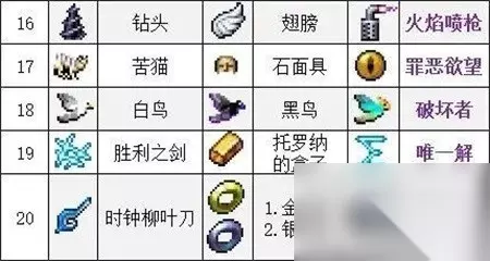 16、钻头+翅膀=【火焰喷枪】 17、苦猫+石面具=【罪恶欲望】 18、白鸟+黑鸟=【破坏者】 19、胜利之剑+托罗纳的盒子=【唯一解】 20、时钟柳叶刀+金戒指+银戒指=【无限走廊】
