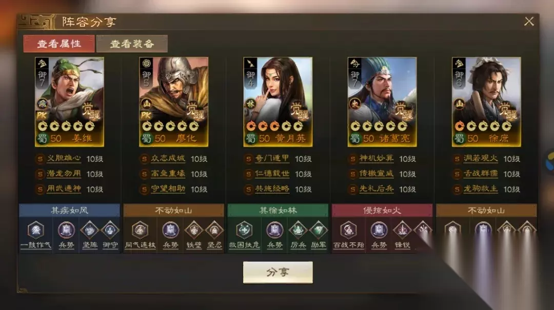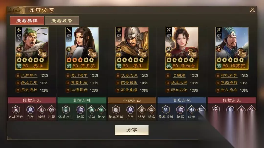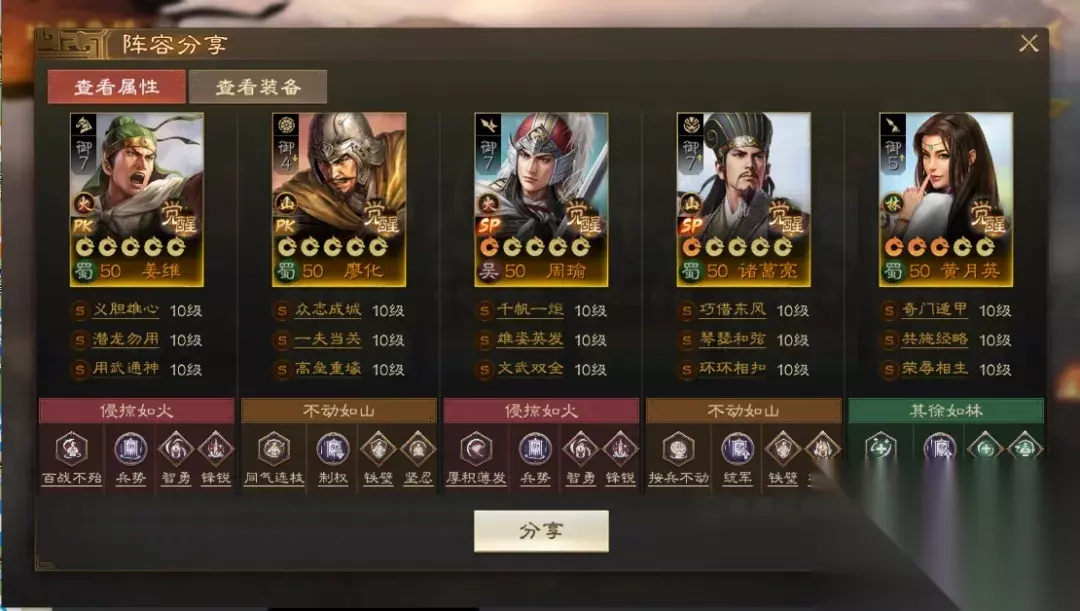 阵容码:team-dMxAb/N09v4Dru6XD6yrR2yyzIFwPUQ/OweiNknNInEA 第3队:衣钵姜维,可自动 带着孙尚香的衣钵姜维,在面对群毒等慢速阵容时有着更大的优势。覆军杀将孙尚香,直接让原本3回合的兵书延长至5回合。当然如果没有孙尚香姜维依然是当之无愧的大哥,无论是马岱,马谡,王平,随着赛季的进行,科技和兵力的提升会让偏慢速的姜维阵容拥有更多持续作战的可能。
