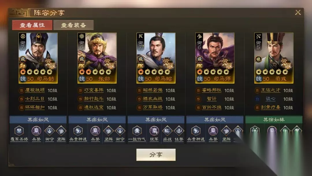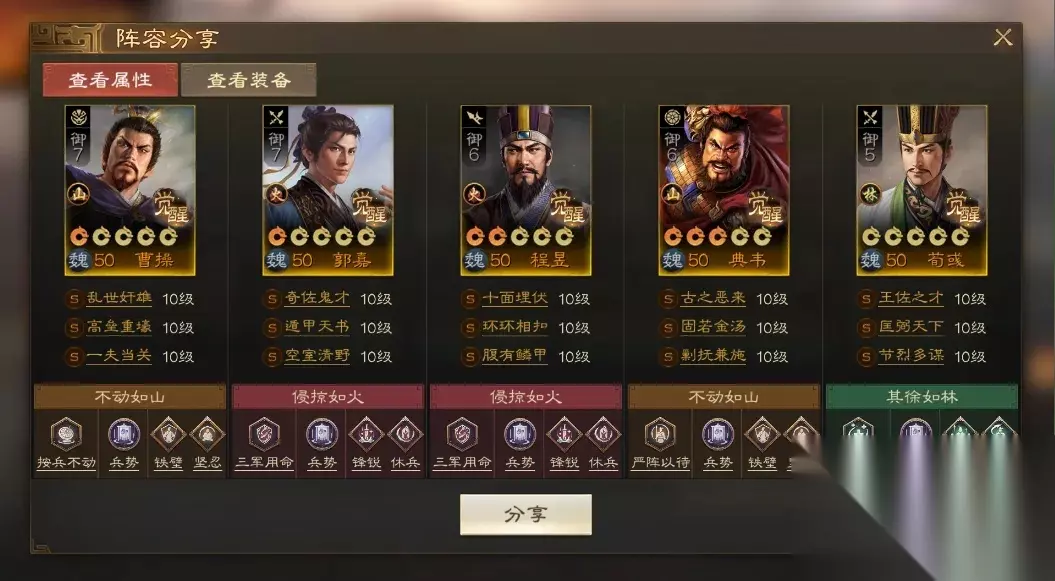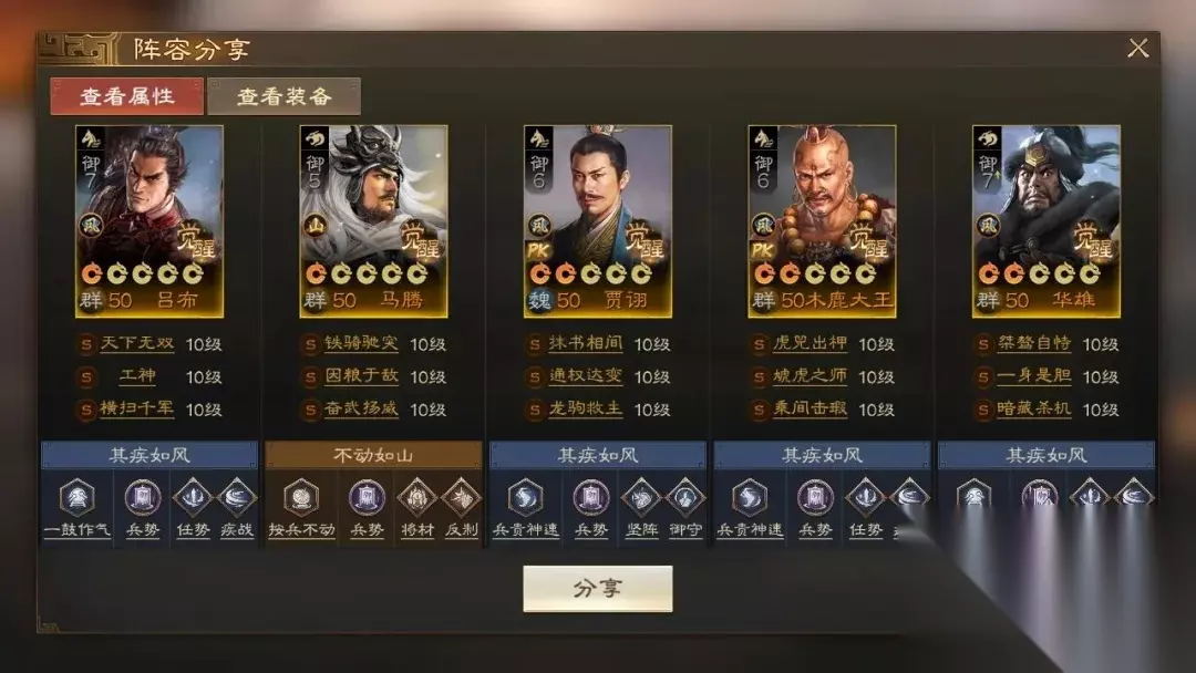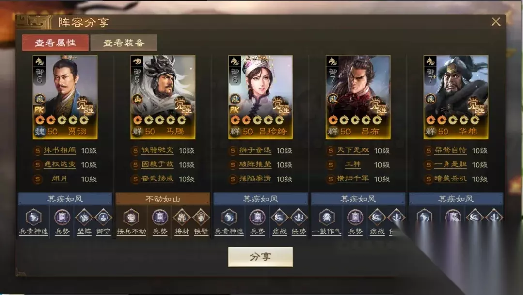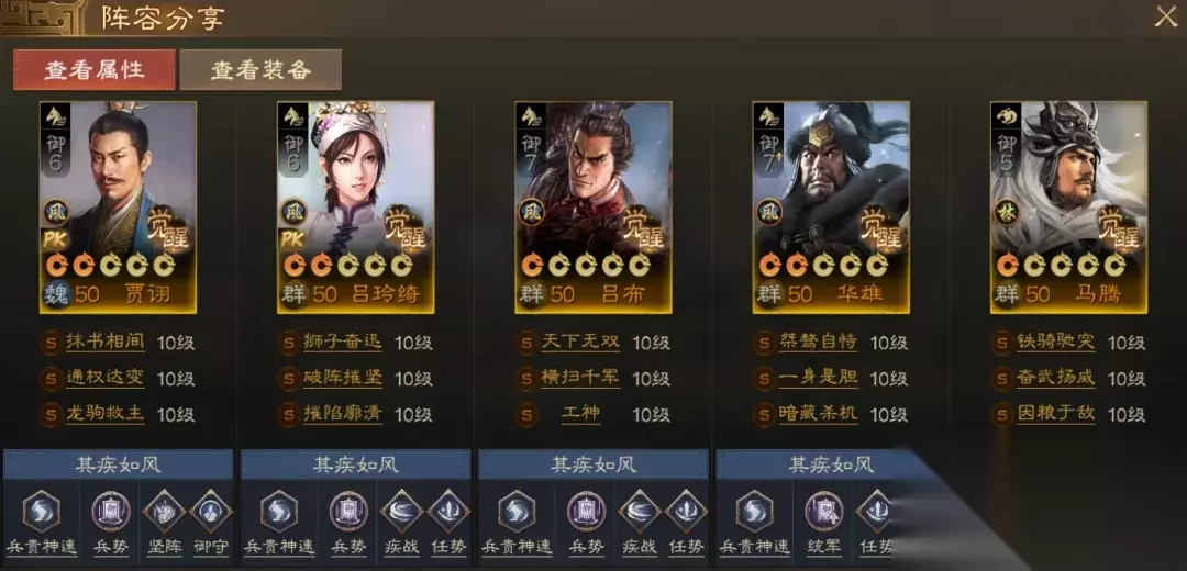 阵容码:team-dMxAb/N09v4Dru6XD6yrR2yyzIFwPUQ/ACjbNknLJn4O 攻略达人-爱发现的随风 第1队:贾诩群骑,主打手操&可自动 目前比较强势的群骑队伍,贾诩先手一控,后面几个输出轮番入场,很多阵容根本是顶不住的。如果你是手操的,可以把龙驹救主换成独行赴斗,保证一定能控到想控的人。没有贾诩可以考虑兀突骨/钟会,相对来说比较好用,华雄也可以换高览带裸衣血战+鬼神霆威/乘间击瑕。