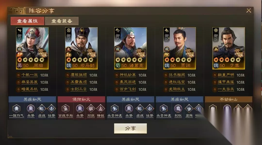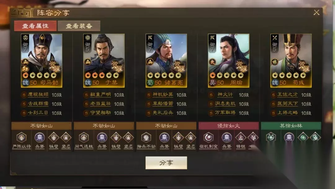 阵容码:team-dMxAb/N09v4Dru6XD6yrR2yyzIFwPUQ/ACGMNknKIH8K 第2队:铁桶三军师,可自动 开荒期过后的于禁和荀彧留下,加入三军师组成铁桶三军事阵容。在于禁、诸葛亮和荀彧的辅助下,司马懿和周瑜有着不错的输出空间和生存能力,前期依靠周瑜单点输出压制对方,后期由司马懿接管对局。(如果司马懿没有舌战群儒战法,可以考虑用环环相扣/五雷轰顶代替)