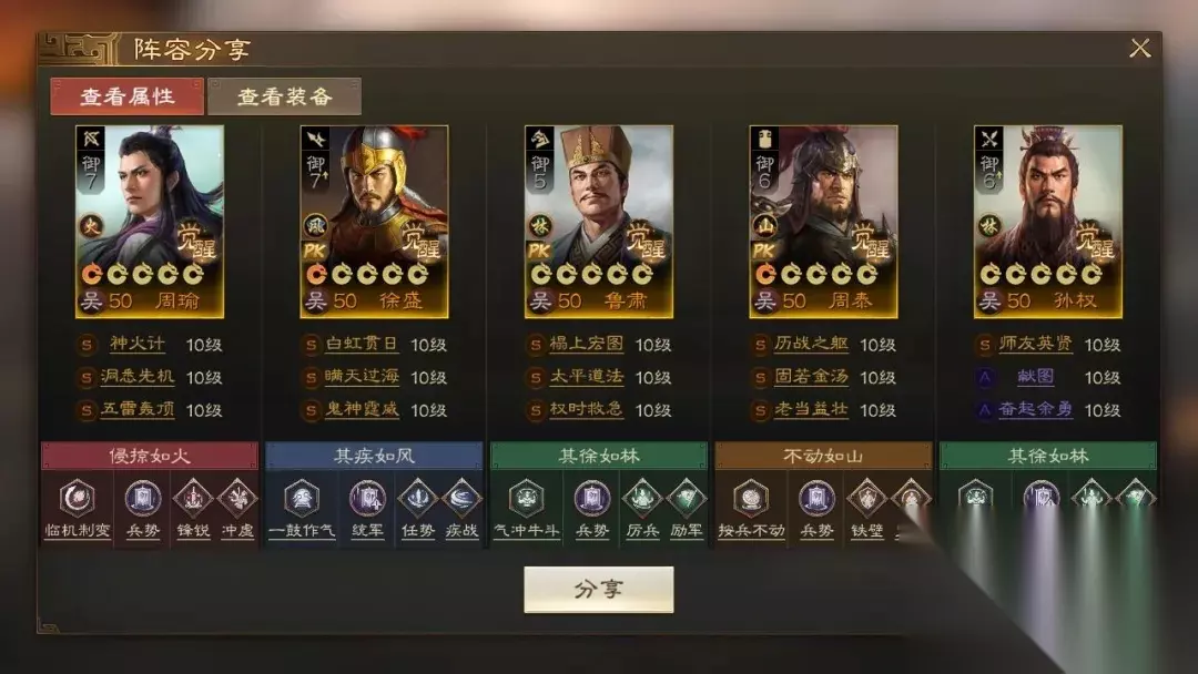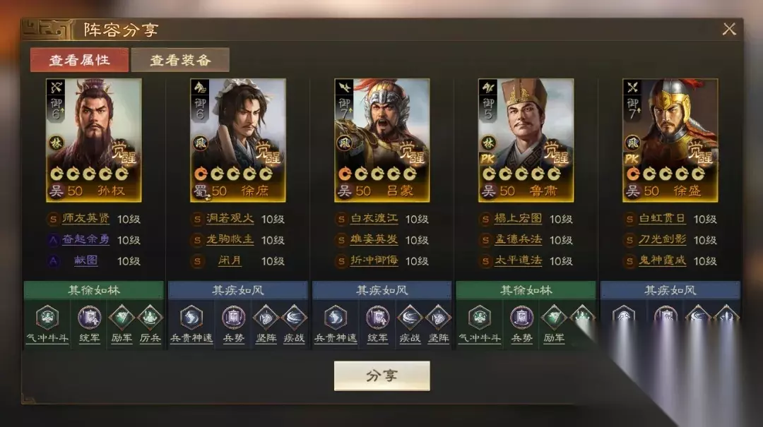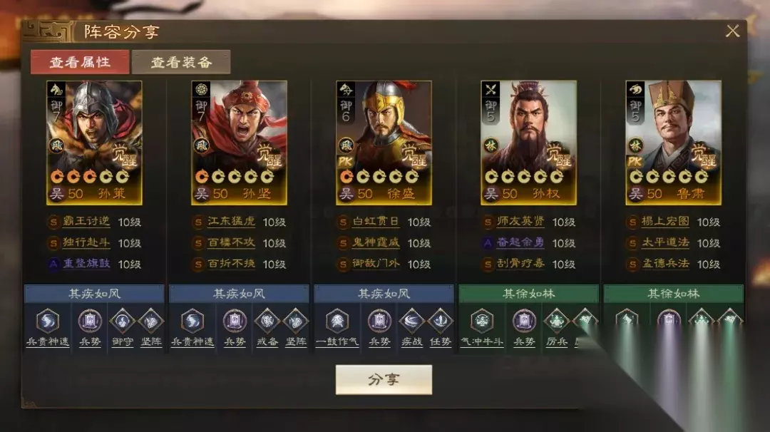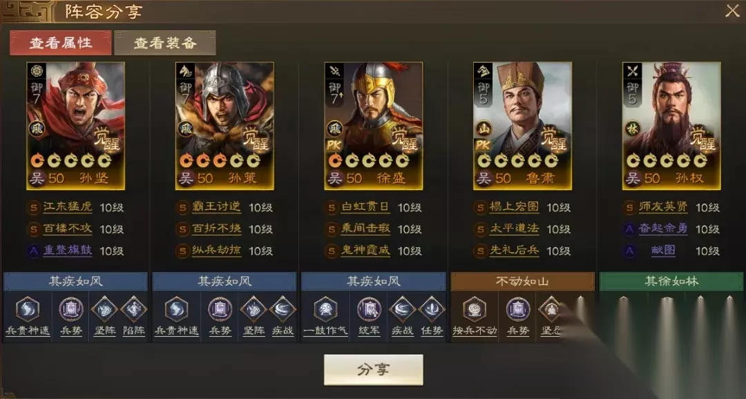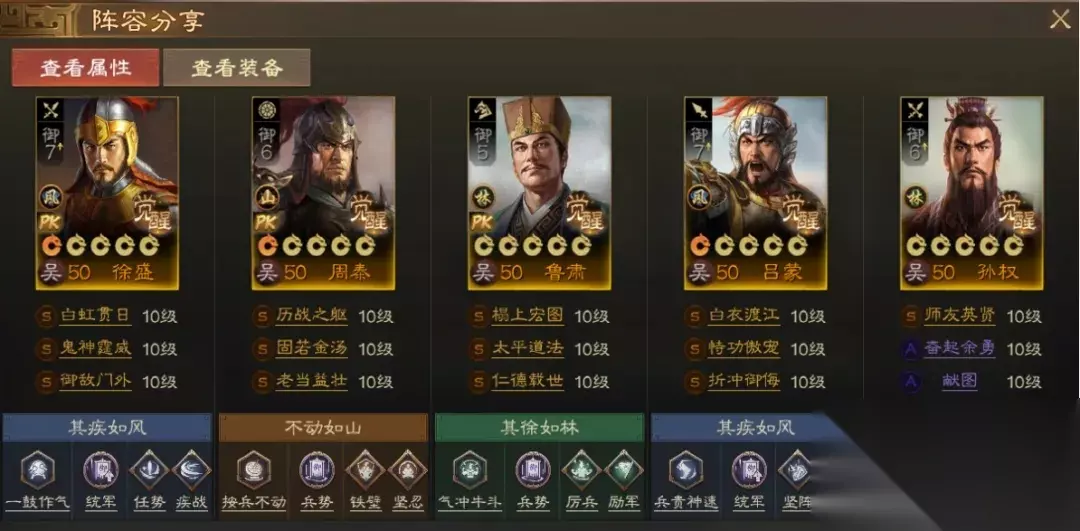 阵容码:team-dMxAb/N09v4Dru6XD6yrR2yyzIFwPUQ/JRe2NknIL34L 第2队:三孙徐盛,可自动&手动 江东双控制+双强力辅助让徐盛获得充足的输出空间,同时使用兵符把徐盛转为枪兵,在保证较远射程同时,能提高自身输出能力和应对骑兵的能力。孙坚携带【重整旗鼓】够硬,性价比高且不抢战法,有条件的话可以带【百折不挠】。
