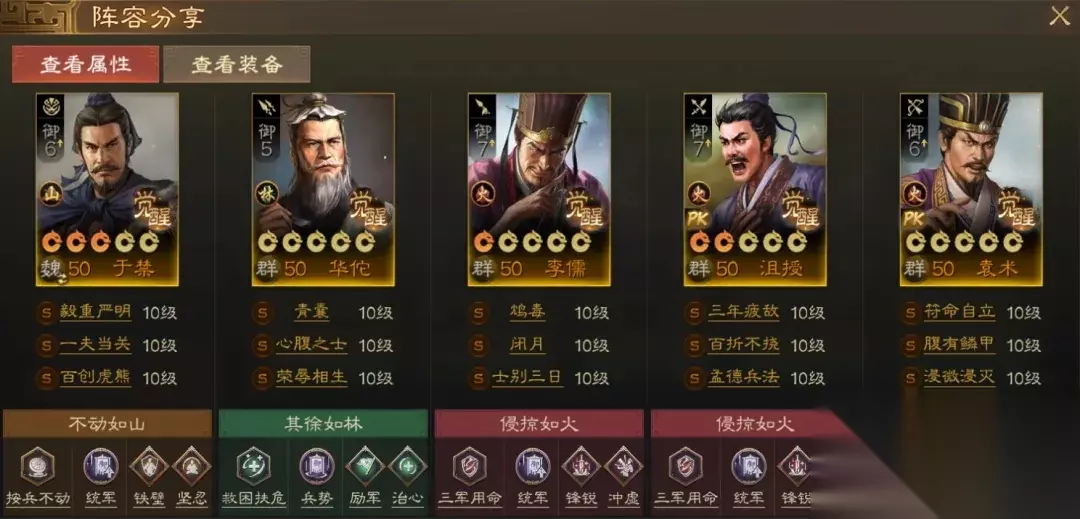 阵容码:team-dMxAb/N09v4Dru6XD6yrR2yyzIFwPUQ/Kie+NknNL3IJ 第2队:于禁群毒,可自动 围绕李儒+袁术+沮授组建的群毒阵容,于禁搭配华佗组成这队的防御体系,光环给了一夫荣辱,然后百创虎熊也算一个小光环,其他人除了袁术都是减伤拉满。这个队伍输出很高,队伍又肉,因为有沮授,一旦对方有一个武将开始阵亡,很容易像多米诺骨牌一样一个接一个倒下。