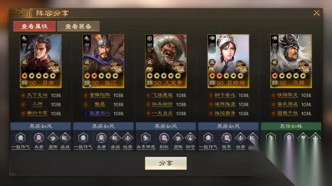 阵容码:team-dMxAb/N09v4Dru6XD6yrR2yyzIFwPUQ/OziuNknOL3MA 先天配将体-三棋苏浅风 第1队:传统群骑,主打手操&可自动 工神横扫的吕布搭配马腾移动力的加持,一直都是群骑在赛季初纵横的基础。吕玲绮的破阵摧坚和摧陷廓清,群可帮吕布破防,单可秒对面脆皮。第三位输出武将通常是张辽、华雄、高览三选一,这赛季高顺也可以利用兵符转换骑兵上阵。最后的辅助,贾诩无疑当前大热门,钟会能够给铁桶阵容带来更大威胁。