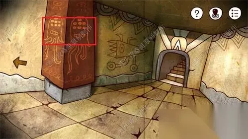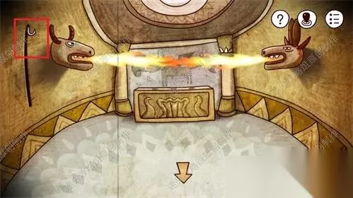 54、前往神庙二层,对红框处使用奇怪的石雕头像。雕像胸口会打开,点击得到红色指针。54
