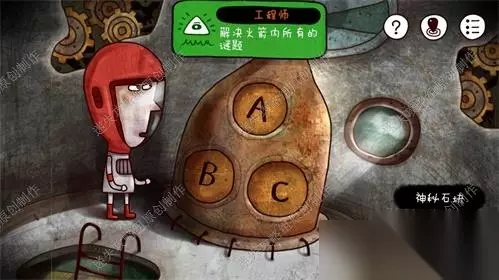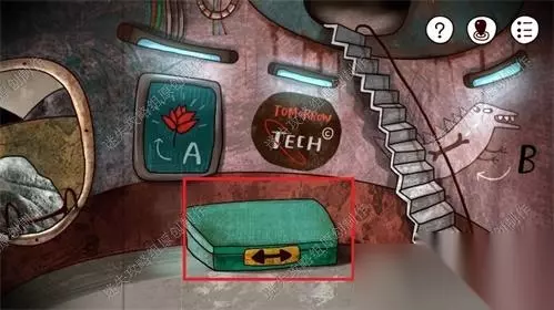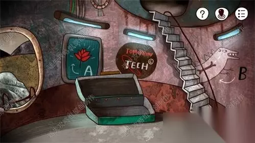 49、前往废弃火箭一楼,墙面上的三样标记给我们提示了三样物品的对应位置:红花对应A、骨头对应B、海星对应C。记录好后前往三层。49