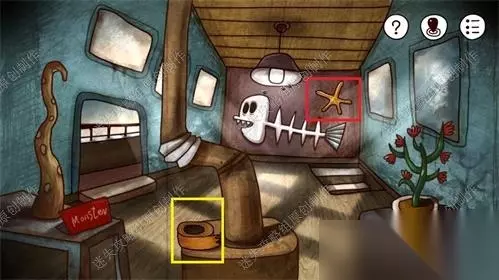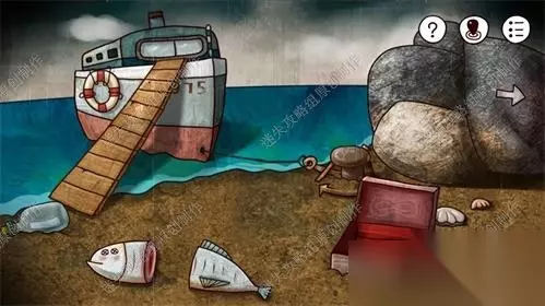 44、船上如果没有点击过船舱的门就与红帽船长对话只会出现两句话:“奇怪,船上的人都去哪儿了?”、“这艘船现在怎么就这么旧了,刚买的时候可是崭新的。”在点击过船舱的门,看到需要密码后再与红帽船长对话:“你想知道船上门的密码吗,我可得认真想想,好像是船出厂的年份。”、“不过那是很多年前的事儿了,那时候我才22岁。”、“现在是哪一年?我是1975年出生的,现在是……”。已经可以推算出船舱的密码为1975+22=1997.对船舱门输入密码,进入。44 45、在船舱一层,首先点击墙上红框的海星和中间管道根部黄框的胶布。然后直接点击红框下方的楼梯下楼。45