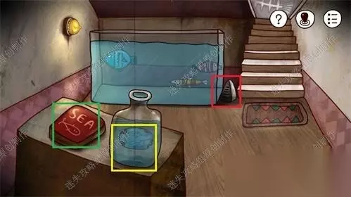 46、船舱二层处,鱼缸边上红框有一块三角形的石头,务必拿上得到神秘石块。对黄框的玻璃瓶使用榔头,一发入魂得到奇怪的蓝色物品(其实是内脏)。然后点击绿框打开红色的书,按需阅读故事剧情,翻到最后可以拿到一个印有月亮图案的圆形石盘,点击获取月亮花纹圆块。46