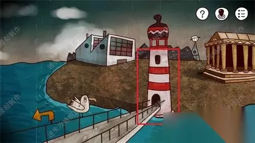 3、首先上岛,点击红圈处红色灯塔放大画面,点击灯塔的门,门的密码就是之前图片中的坐标。输入即可开门。开门后直接进入。3、1