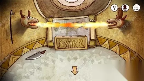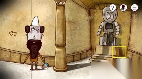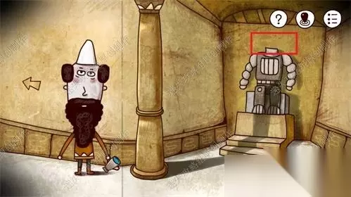 61、前往神庙二楼,对雕像下方黄框处点击后,对红框部分使用铁钩,打碎木头盖板后得到里面的神秘石块。61