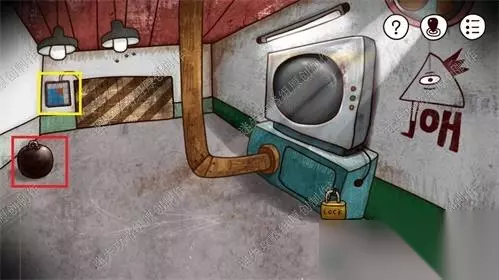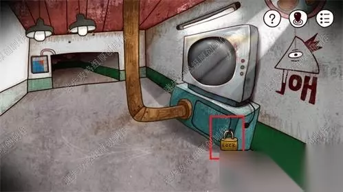 48、在工厂走到右侧的电视机下方红框有个锁,对这把锁使用铁钳切断锁,点击打开盖板,对电线断口处使用胶带。电视机会开始闪烁画面。48