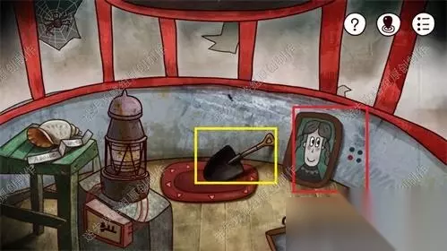 7、再点击蓝帽大叔边上的梯子前往灯塔三楼,先拿到地上黄框的铲子。同时看到红框位置的画像,意思是四个按键的左下角这个图形是右边部分点亮。7