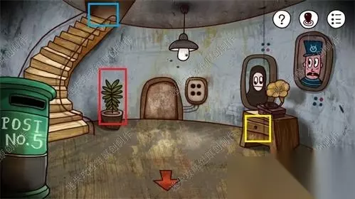 4、进入灯塔后,首先红框内的植物连续点击三次,可以摇出一个柜子把手掉到地上,点击获取柜子把手。点击黄框放大后将柜子把手装在抽屉的空洞上,抽屉自动打开里面有一把剪刀,点击获取,得到一把剪刀。之后直接点击蓝圈楼梯上二楼。4
