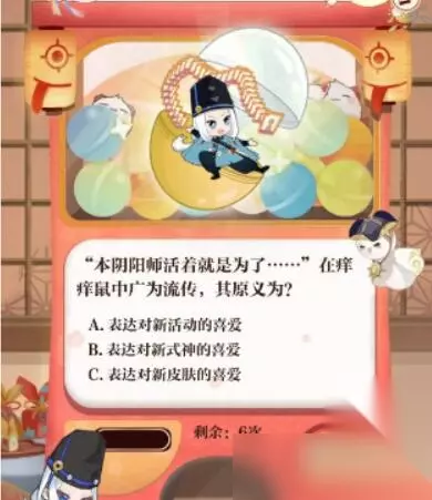 阴阳师回忆扭蛋机答案 1、活动时间 9月13日-9月26日23:59 2、活动地址 答案一览 1、本阴阳师活着就是为了......在痒痒鼠中广为流传,其原义为? 答:表达对新式神的喜爱