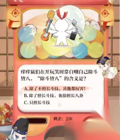 5、痒痒鼠们在开玩笑时常自嘲自己除斗皆八,除斗皆八的含义是? 答:除了不擅长斗技,其他都厉害