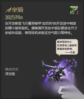 ff14中,加百列α坐骑的获得方法是玩家寻宝鉴定获得,在开发新型飞行魔导装甲“加百列”的开发途中制造的缩小版实验机,据推测开发技术组在建造全尺寸的试作品前,曾用该机体验证空气阻力等特性,此外ff14仅游戏内可获取坐骑的渠道就非常多,除了寻宝鉴定获得外还有货币兑换、副本掉落、成就奖励等等。 点此查看具体获得方法 5.黑天马
