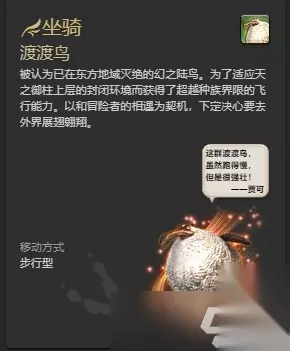 ff14中,暴龙坐骑的获得方法是玩家寻宝鉴定获得,被人叫做“暴君”的古代肉食兽,由于长时间沐浴在瓦尔岛的风属性以太中,拥有不可思议的浮游能力,虽然性格凶暴无比,但会服从认定了实力的冒险者,此外ff14仅游戏内可获取坐骑的渠道就非常多,除了寻宝鉴定获得外还有货币兑换、副本掉落、成就奖励等等。 点此查看具体获得方法 2.渡渡鸟