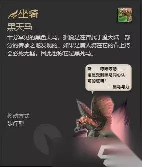 ff14中,黑天马坐骑的获得方法是玩家寻宝鉴定获得,十分罕见的黑色天马,据说是在曾属于魔大陆一部分的传承之地发现的,如果是庸人骑在它的背上将会必死无疑,因此也称它是黑死马,此外ff14仅游戏内可获取坐骑的渠道就非常多,除了寻宝鉴定获得外还有货币兑换、副本掉落、成就奖励等等。 点此查看具体获得方法